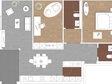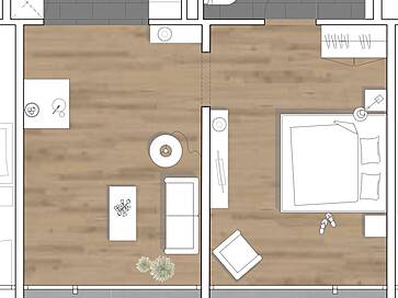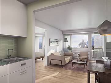 Im 4. Stockwerk des bestehenden Gebäudeteiles entstehen neu Wohnungen. Da die Schottenstruktur des Gebäudes aus statischen Gründen nicht durchbrochen werden kann, entstehen hier 14 Wohnungen: